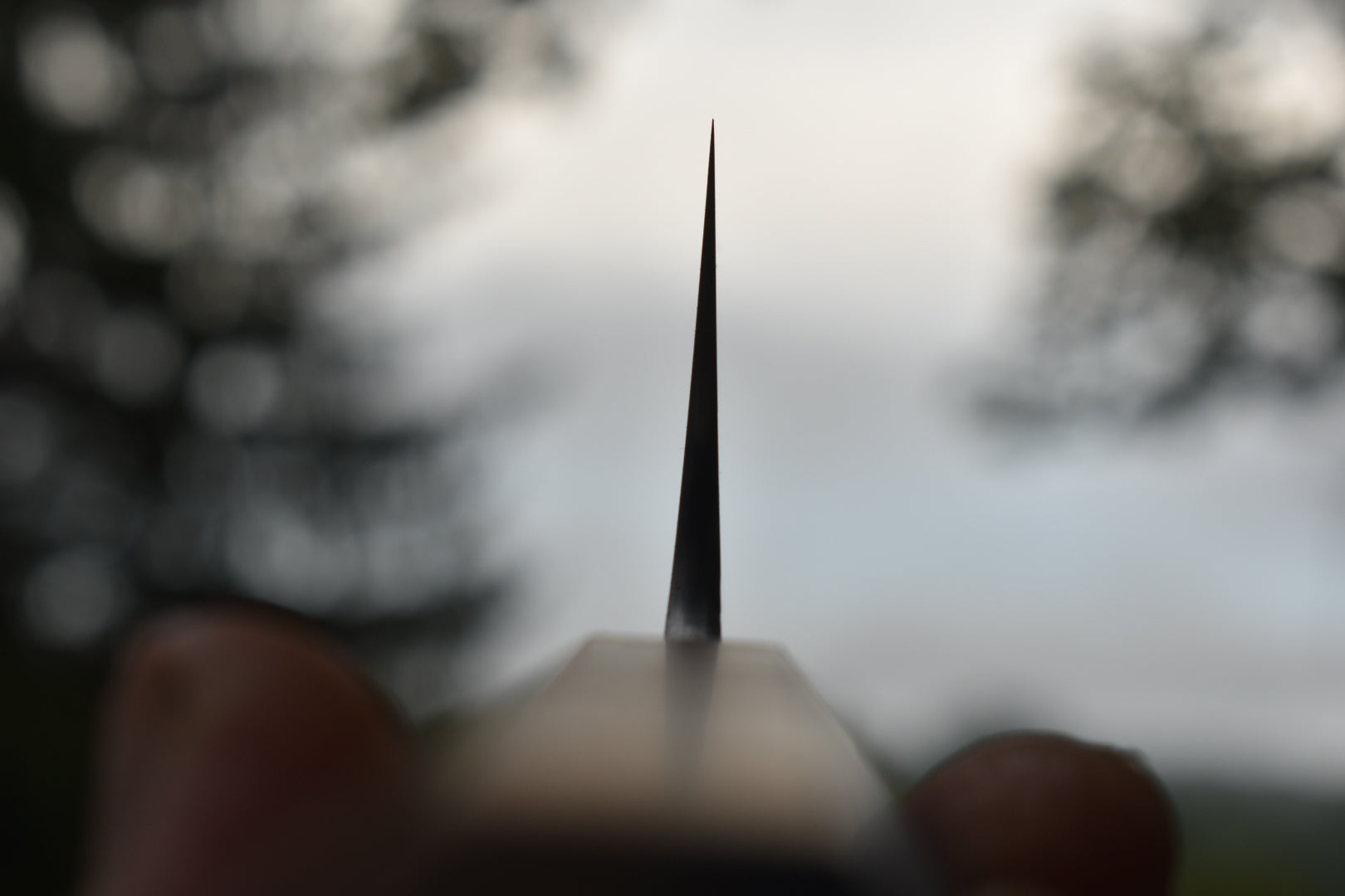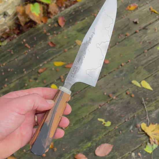 Blade is inspired by the shape of a Bowie Knife, edge shape is similar to a German style chef.