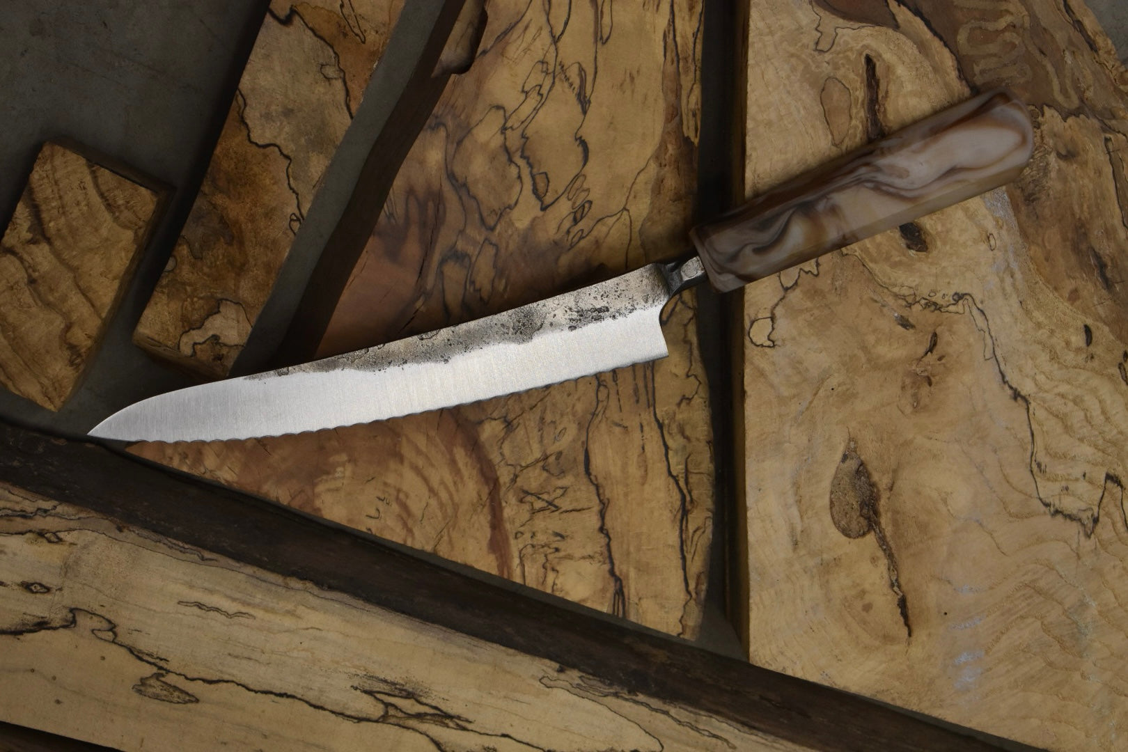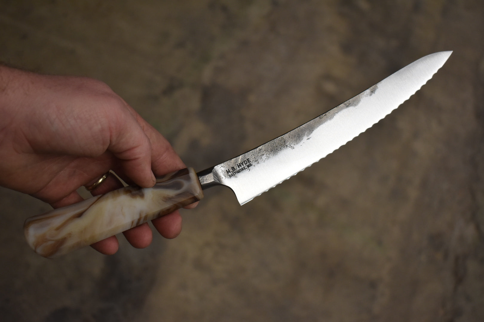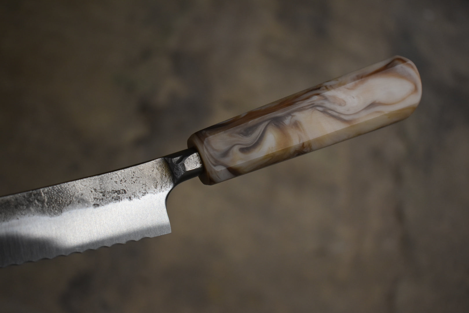 207 x 35mm bread knife with resin handle. The resin was poured in shop by my sister, Nora.