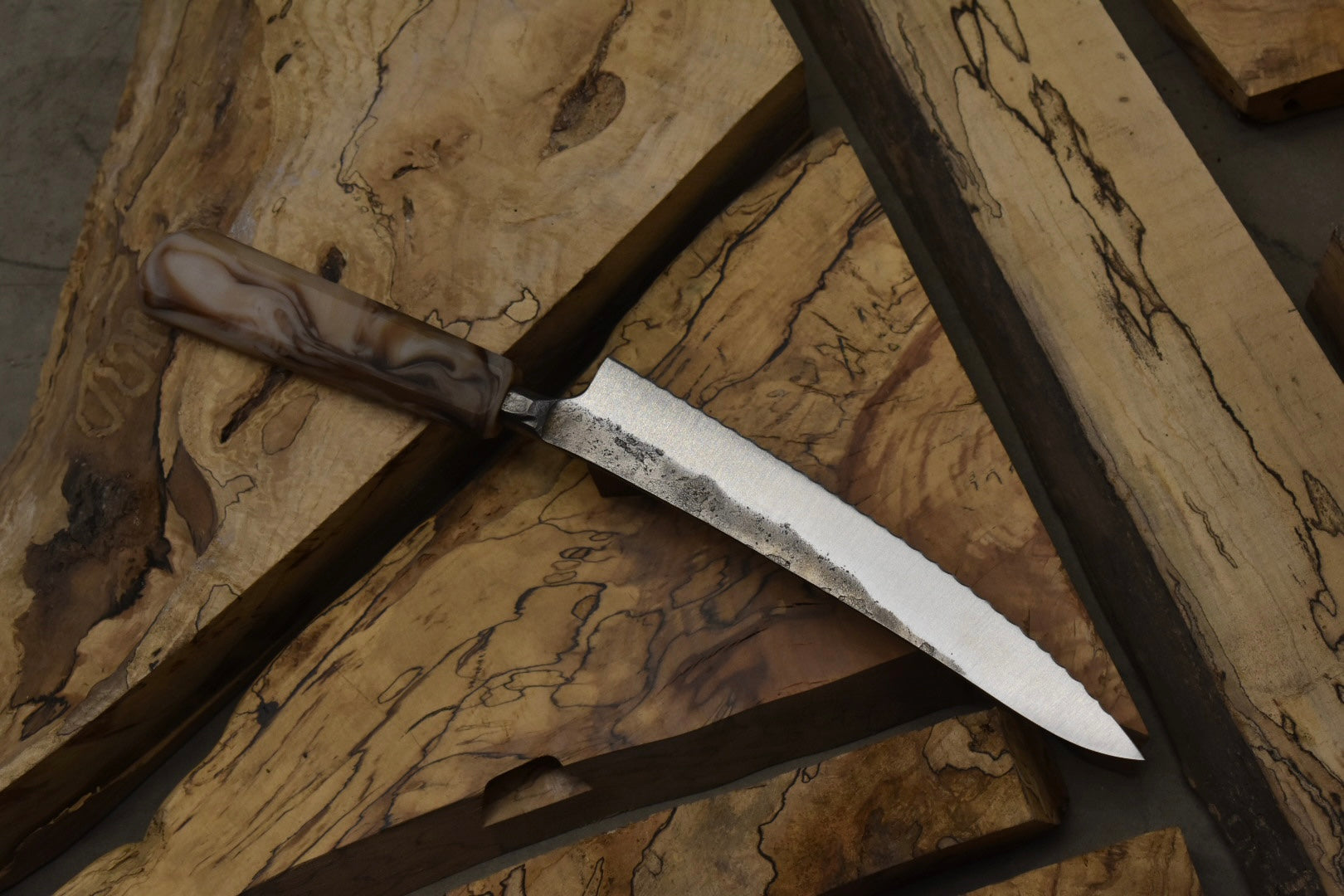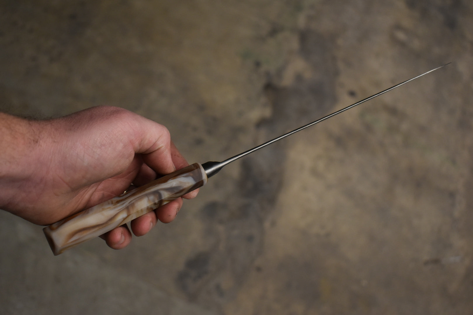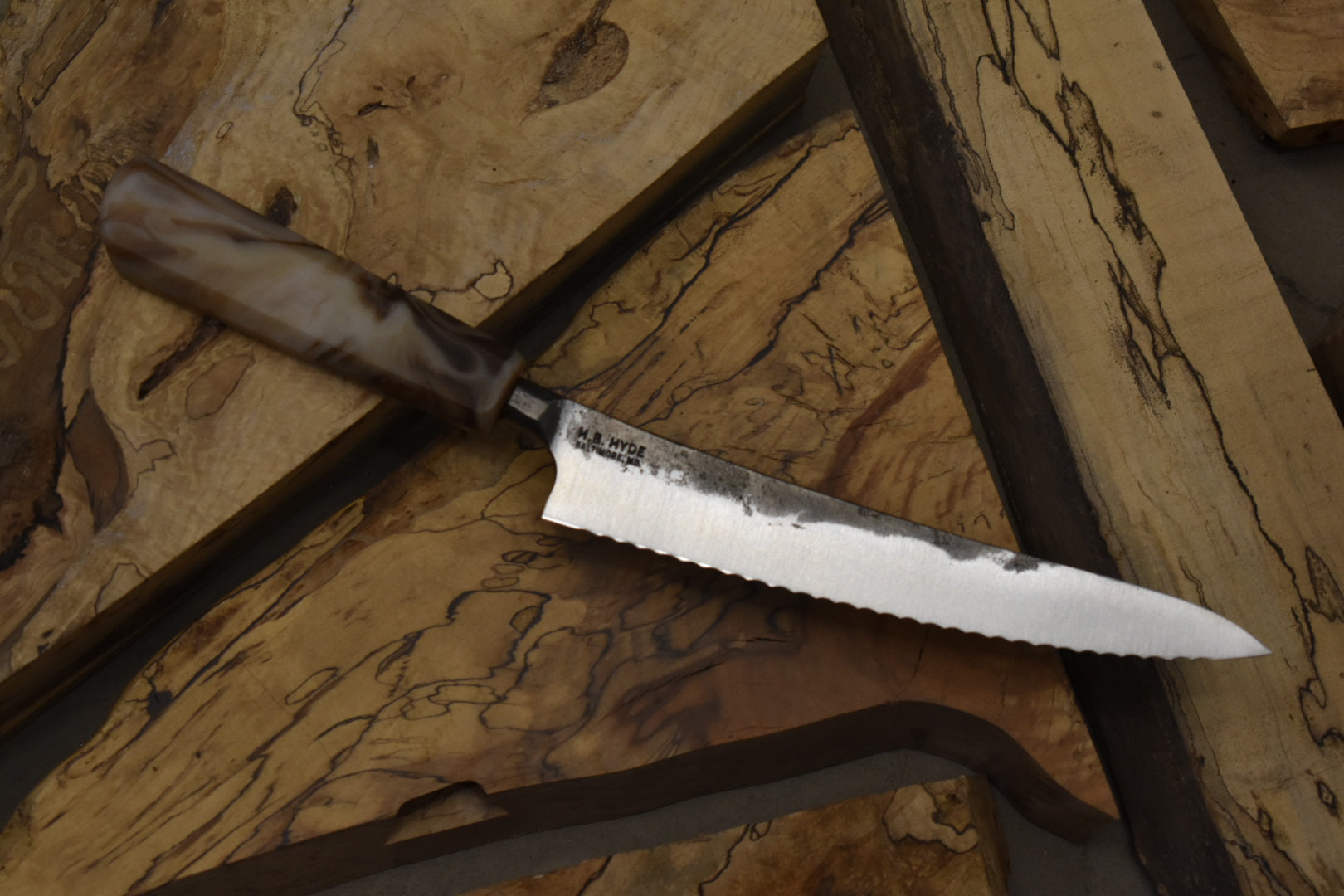 207 x 35mm bread knife with resin handle. The resin was poured in shop by my sister, Nora.
